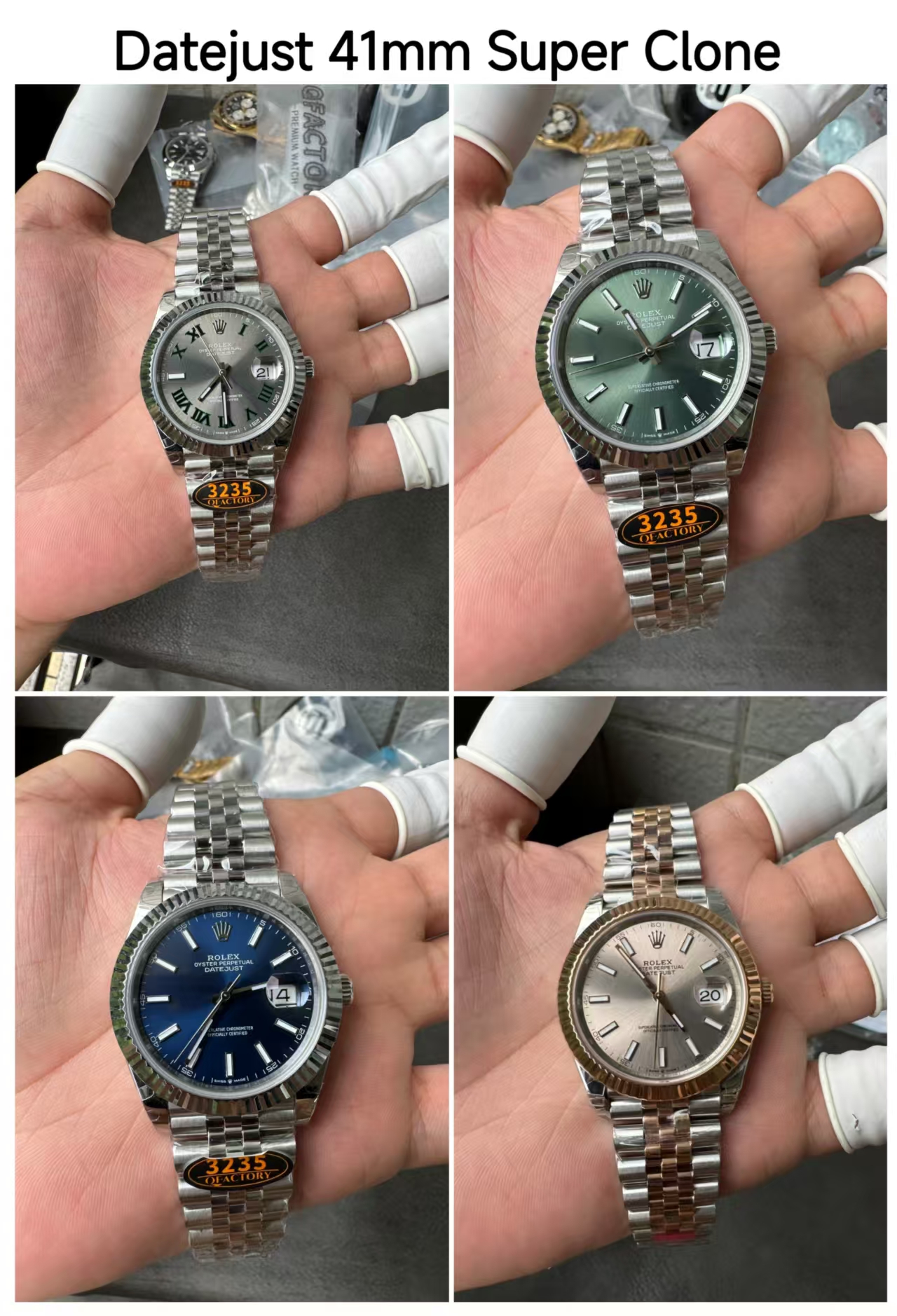 4. Rolex Datejust Super Clone Watches: Within the Rolex Datejust collection, the 41mm models stand out as some of the most popular choices. From the classic champagne dial with two-tone bracelet to the elegant blue dial version, these watches are highly sought after. Each model features the 3235 Swiss clone movement with a date display at the 3 o’clock position.
